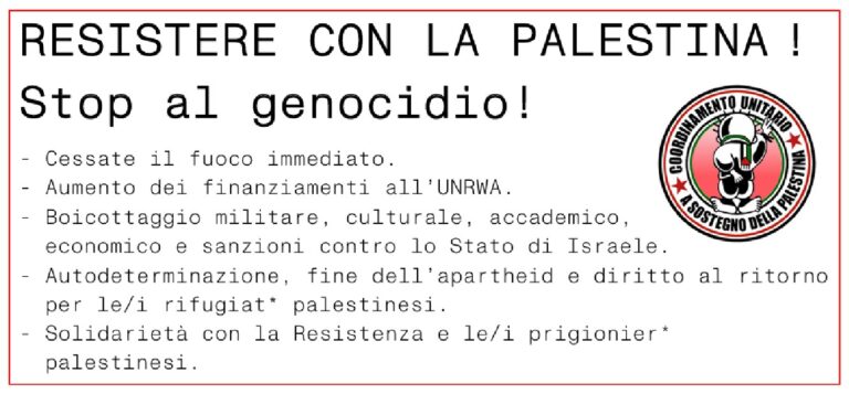 Di fronte al susseguirsi di immagini e testimonianze sempre più atroci che giungono dalla Striscia di Gaza, alla complicità dei media e governi occidentali e al non rispetto del diritto internazionale, la mobilitazione dal basso su scala globale delle persone comuni e dei movimenti sociali rimane l’unica via per far pressione sullo Stato sionista e resistere a fianco del popolo palestinese nella sua lotta per la liberazione dal giogo del colonialismo israeliano sulle proprie terre.